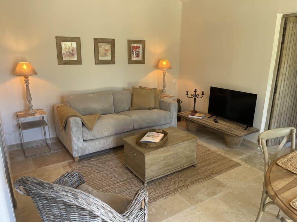 Un véritable chez-soi en Provence. De plain-pied, le gîte comprend une pièce à vivre lumineuse, une cuisine entièrement équipée, une chambre avec lit king-size et une salle de bains avec douche à l’italienne. Idéal pour deux, en toute autonomie.